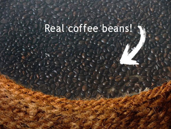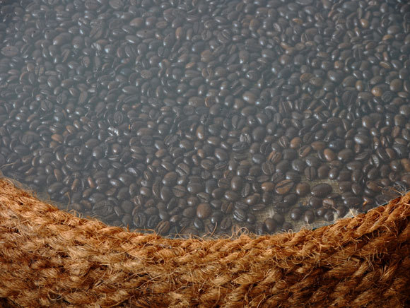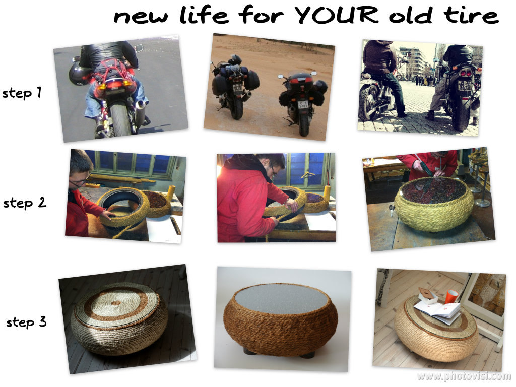 ☯ This handcrafted coffee table is made by two recycled motorcycle tires, coconut rope and coffee bean decorated top. It is finished with tempered glass on the top.