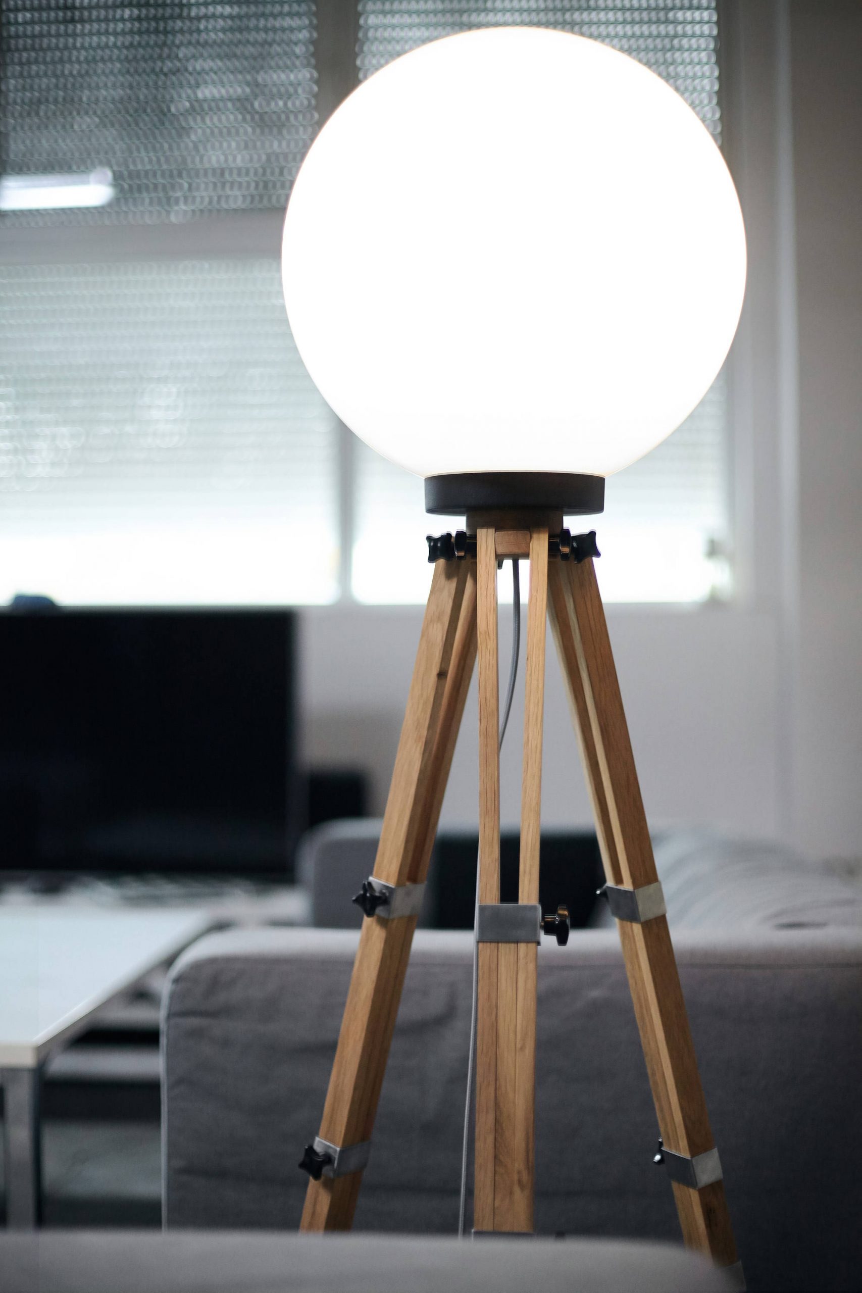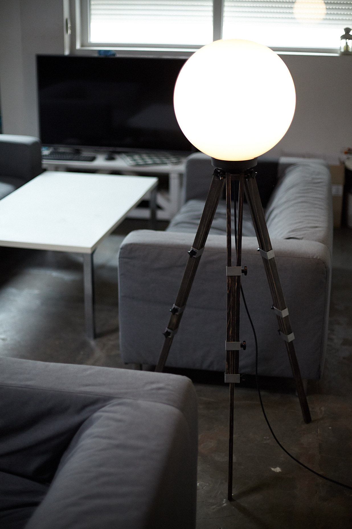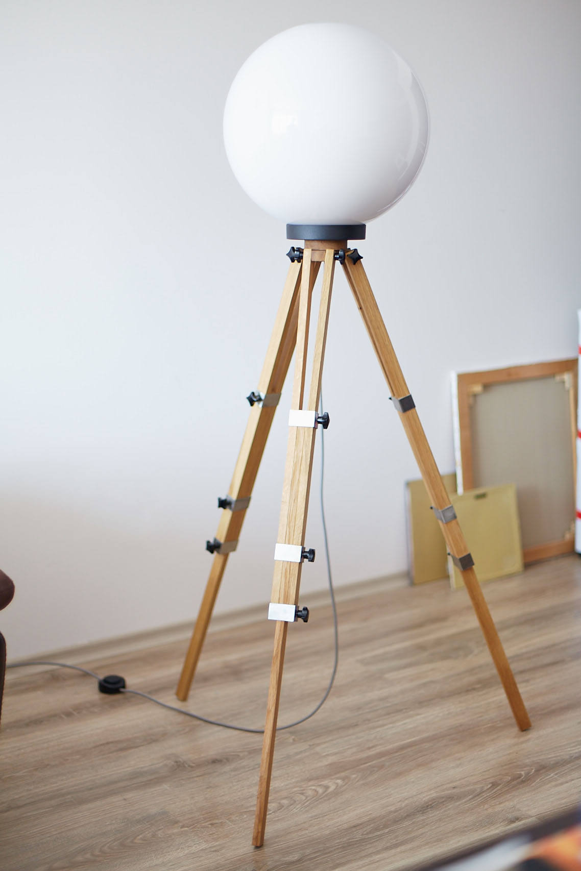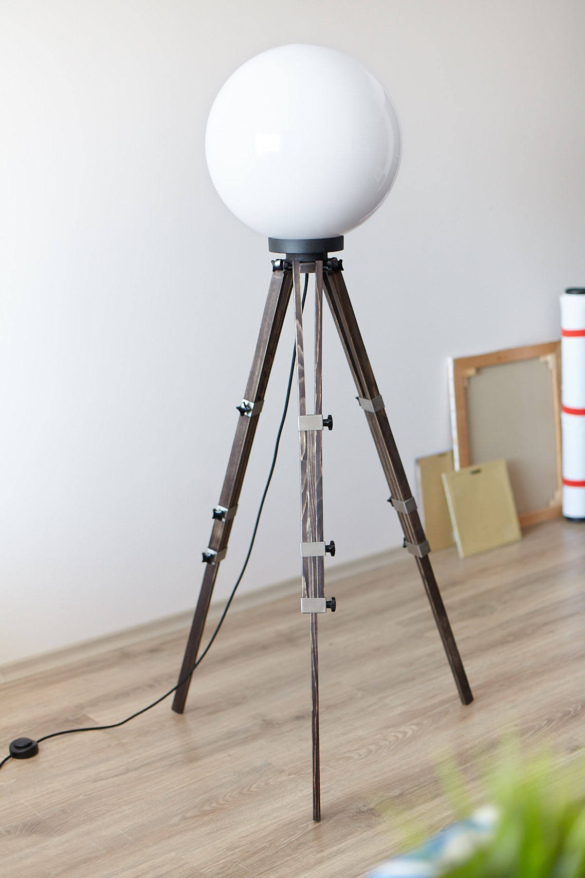 Overall height: The lamp adjusts between 140-175cm by bending and stretching the feet of the tripod. The ball’s diameter is 40cm and the “legs” can be straddled, however it’s recommendable to adjust them by 40-60cm. The weight of the piece is 4.5 kg.