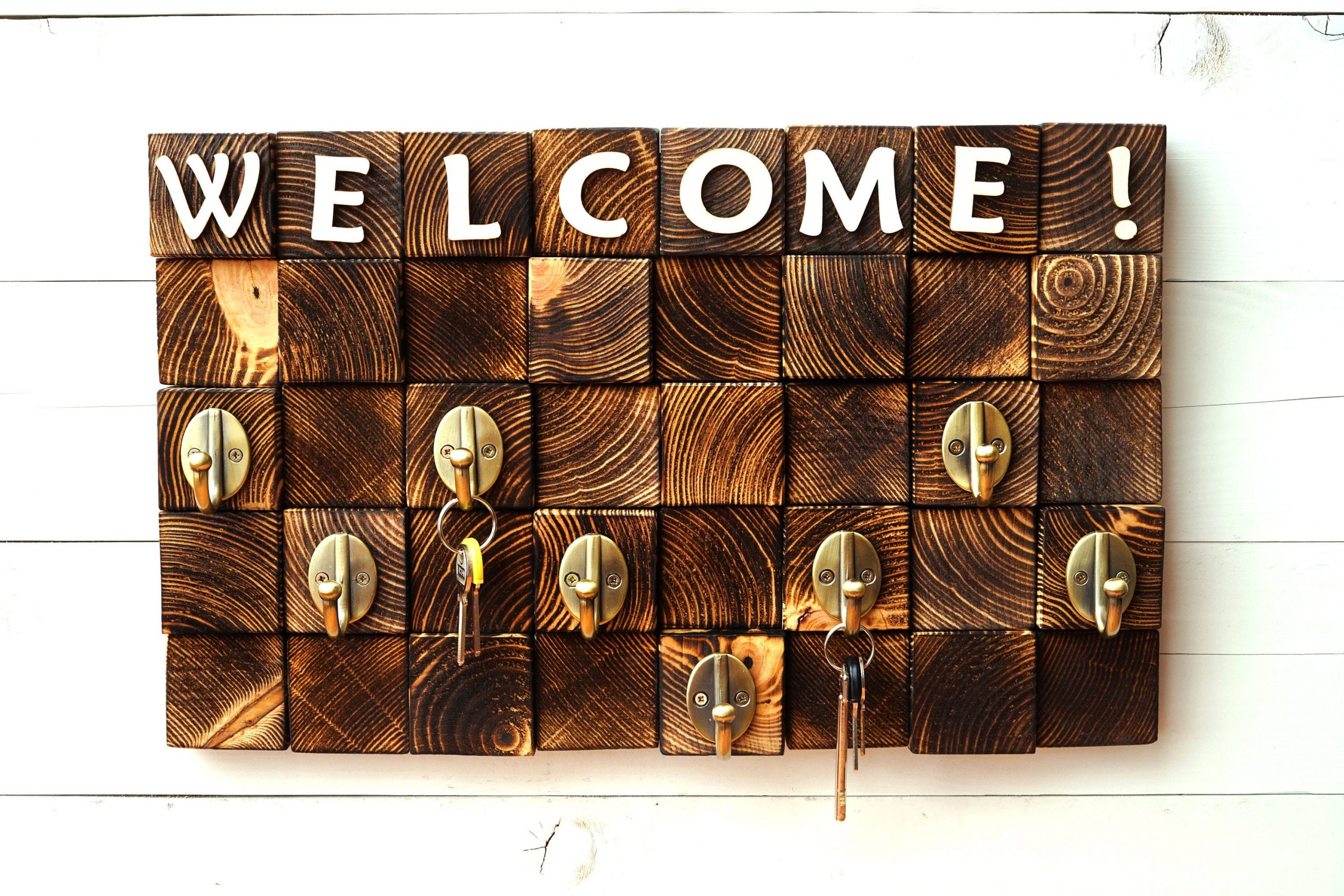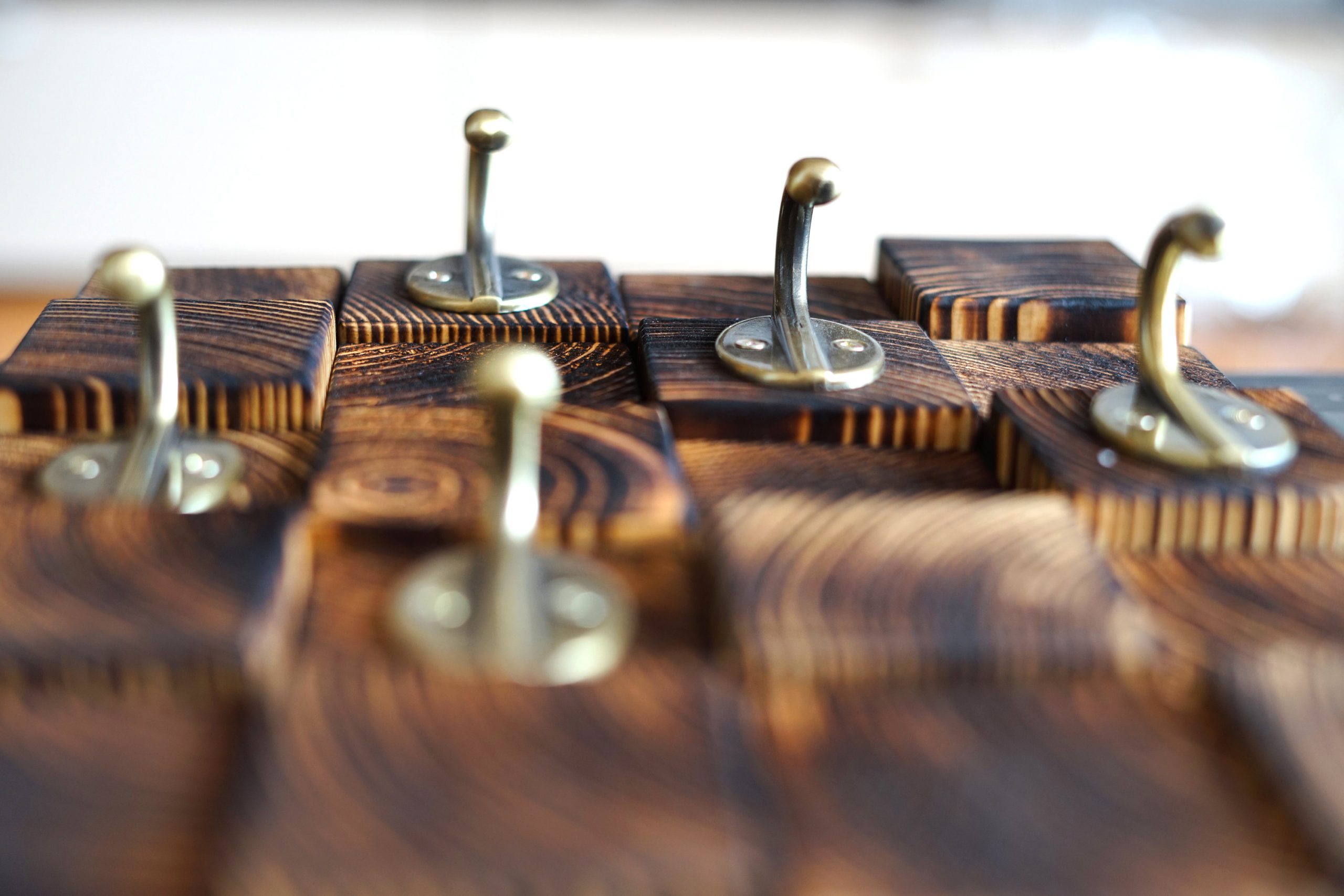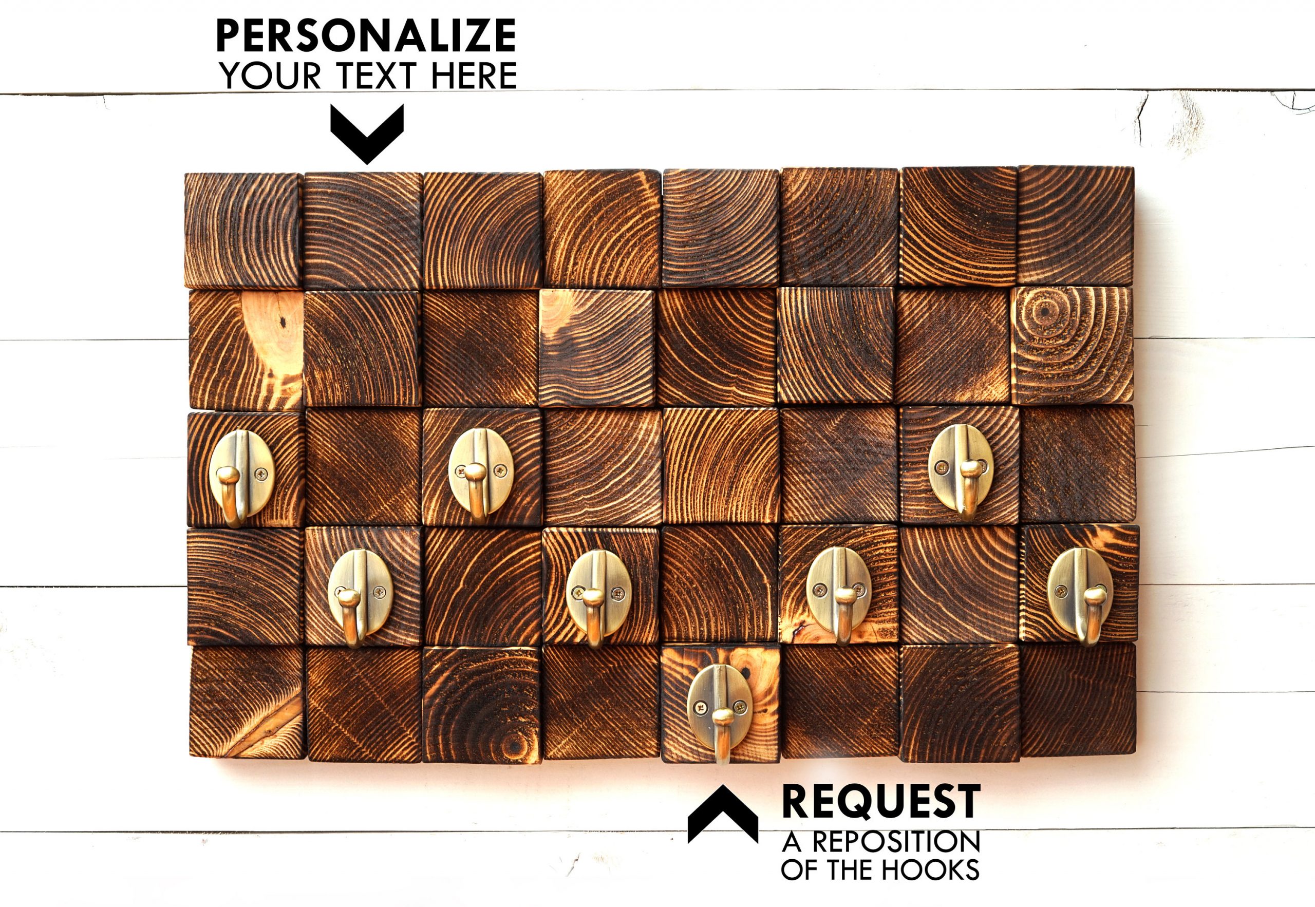 ☯ This unique wood mosaic key hanger is made with our own hands in our workshop from natural pine tree. You can request your own text and the position of the hooks can be changed by your preference! Please feel free to contact us if you have special requests about the sizing and your choice of color as well! Because of the handmade nature of the products, small variations may occur.