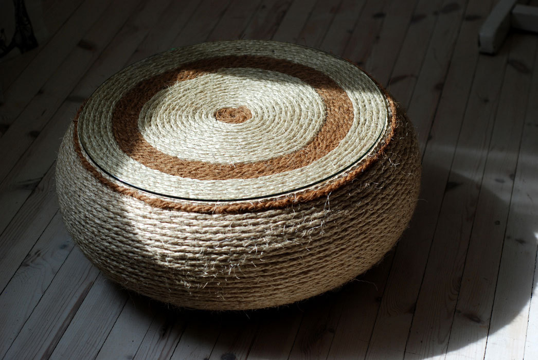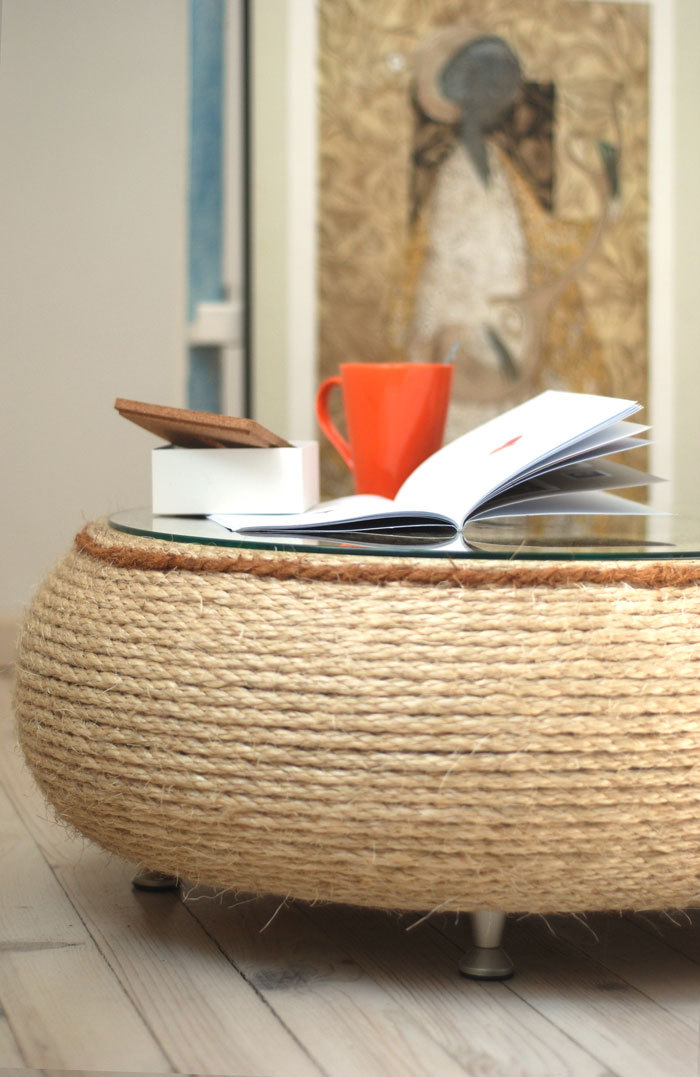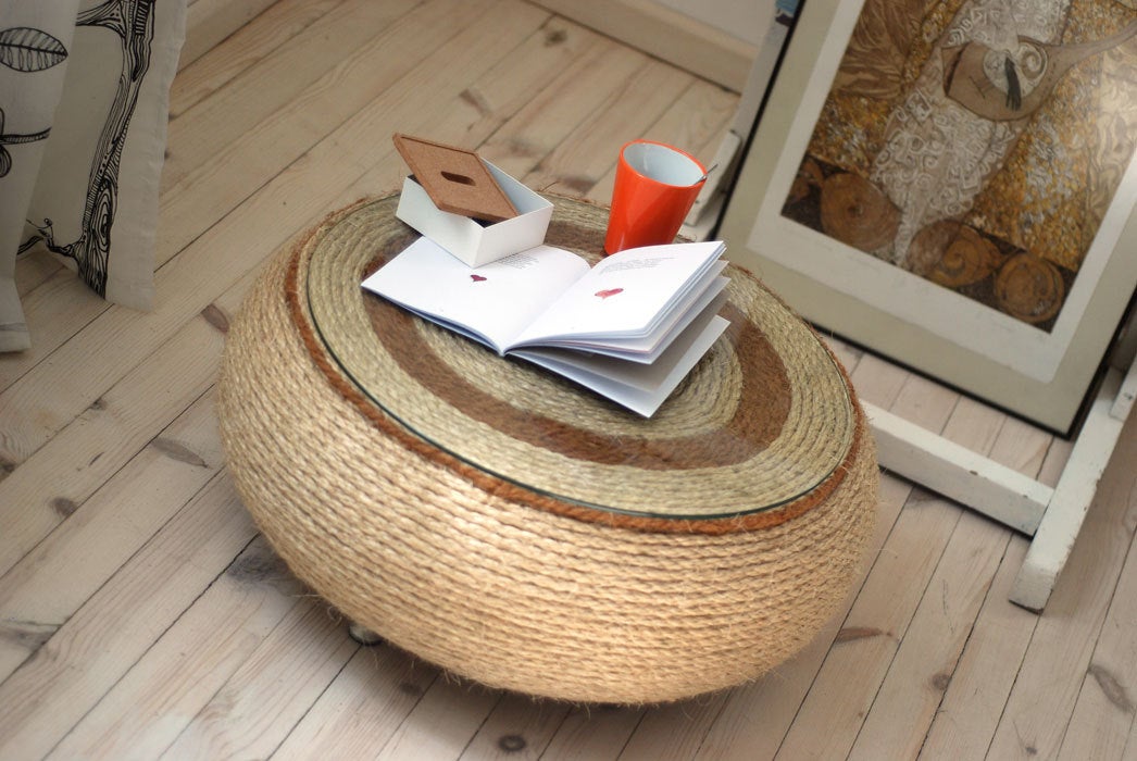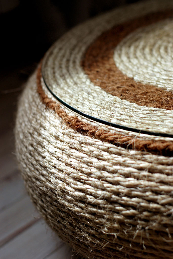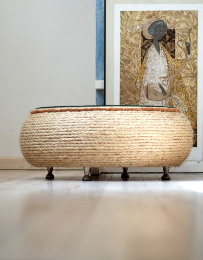 ☯ This handcrafted coffee table is made by recycled motorcycle tire, hemp and coconut rope. It is finished with tempered glass on the top.