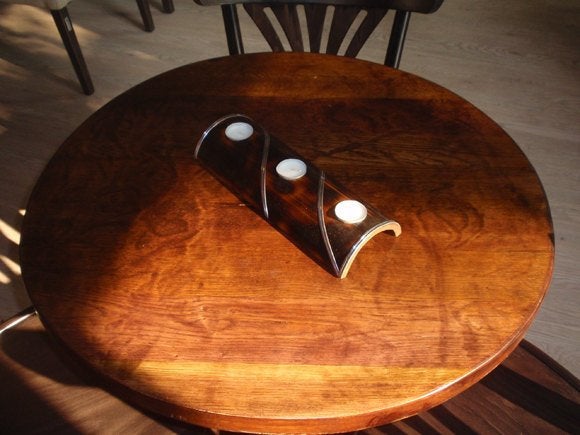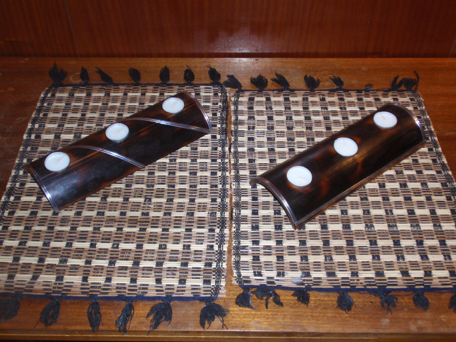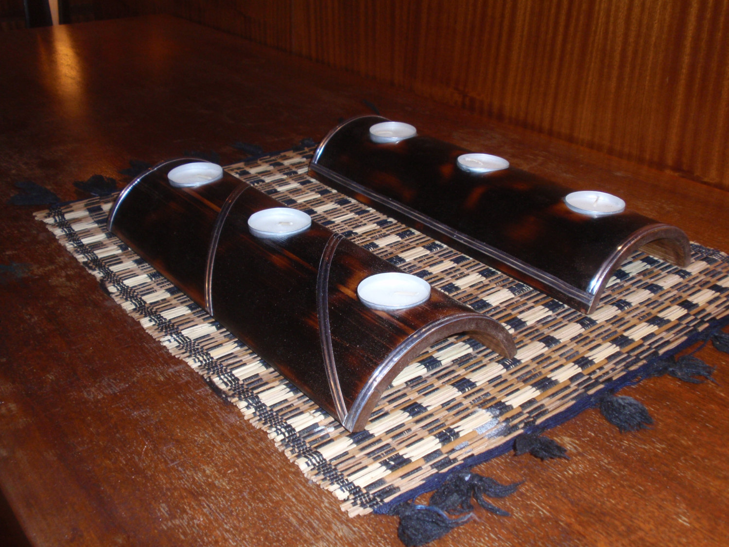 ☯ This rustic candle holder is handmade from flame-treated piece of bamboo with lead decoration and is designed for 3 tea candles.